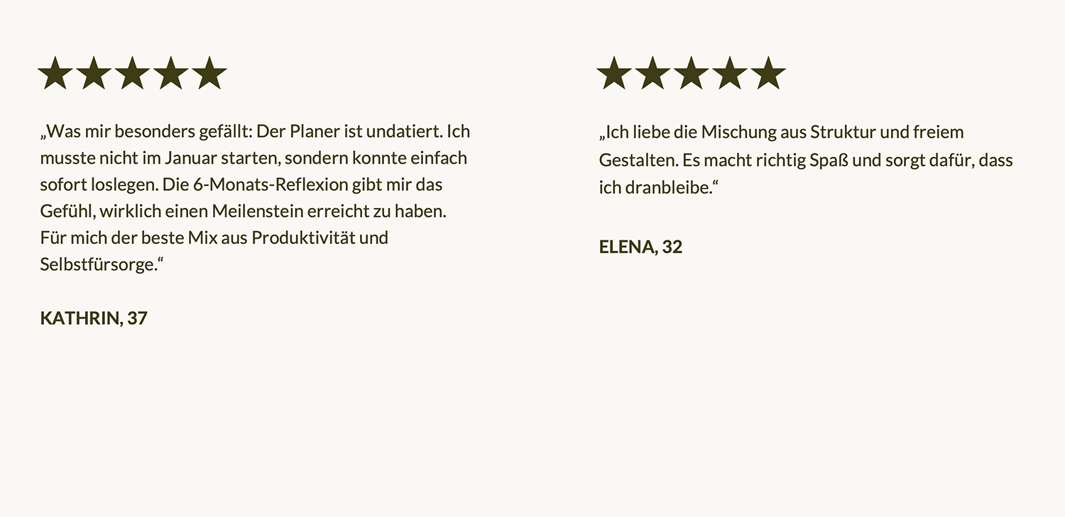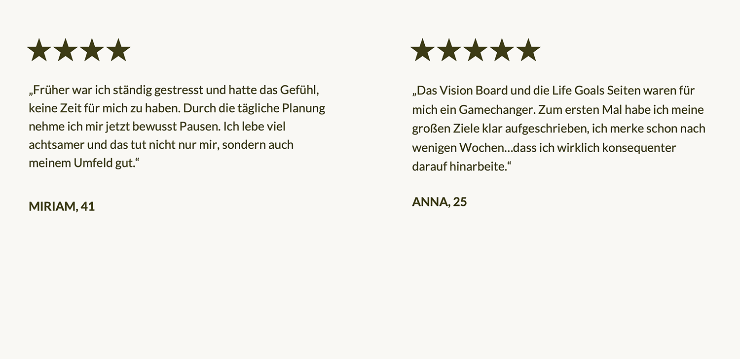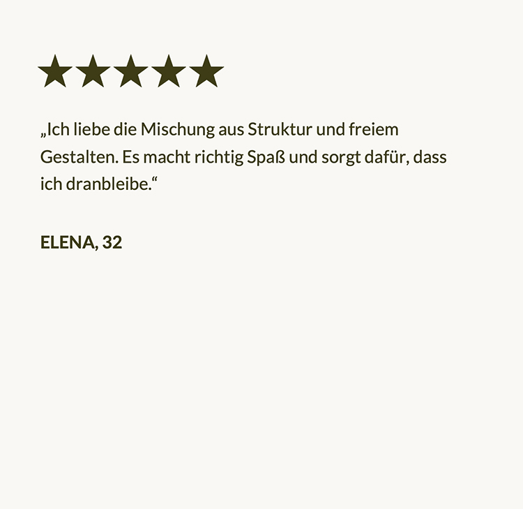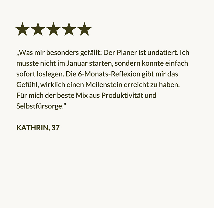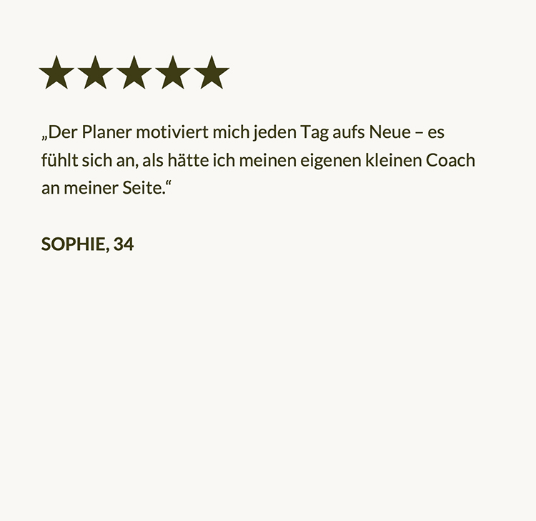Er bietet dir eine klare Struktur, gefüllt mit Inspiration & Coaching-Elementen, die dir helfen, wirklich dranzubleiben. Ein Hybrid aus Planer, Journal und Selfcare Coach. Für alle, die nicht nur organisieren, sondern wachsen wollen.