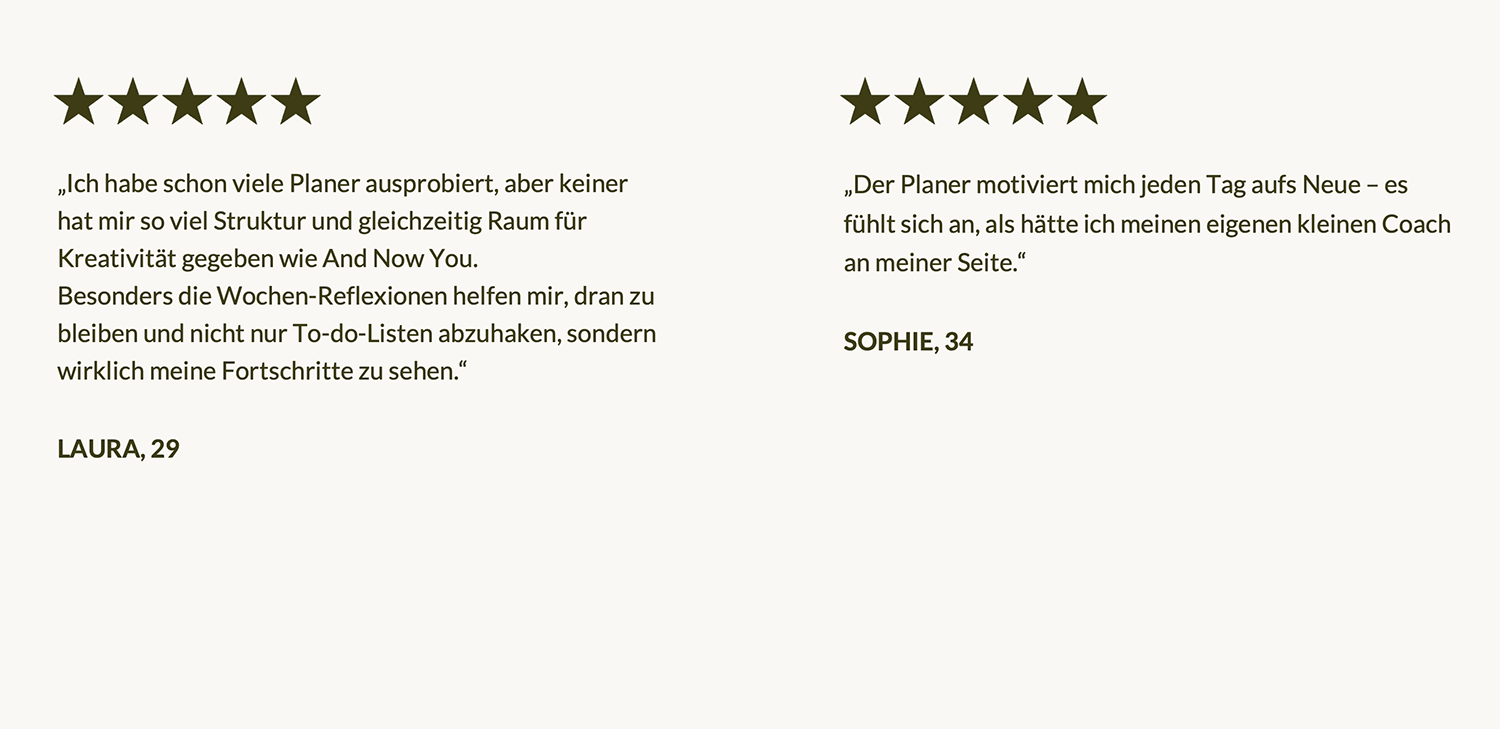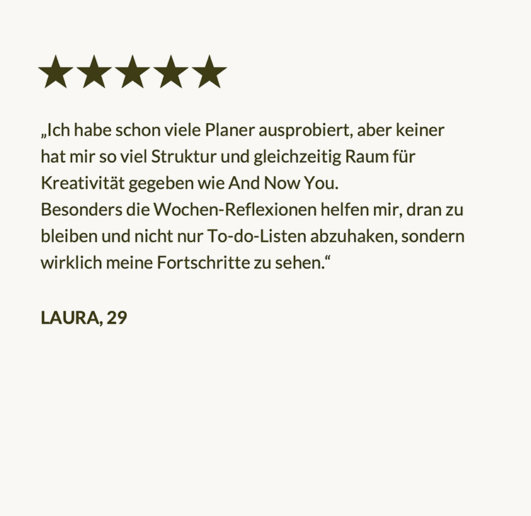 Anders als klassische Bullet Journals ist & now you kein leeres Notizbuch. Er bietet dir eine klare Struktur, gefüllt mit Inspiration & Coaching-Elementen, die dir helfen, wirklich dranzubleiben. Ein Hybrid aus Planer, Journal und Selfcare-Coach – für alle, die nicht nur organisieren, sondern wachsen wollen.