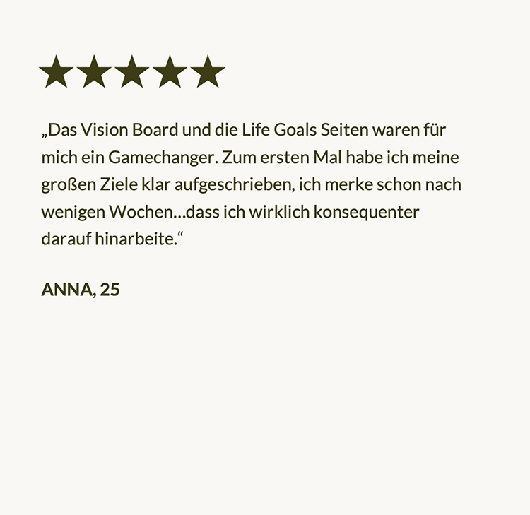 Hier findest du alles, was du brauchst, um Visionen greifbar zu machen: Platz für Ideen, Struktur für deinen Alltag und Impulse für dein inneres Gleichgewicht. Seite für Seite wächst aus einem Gedanken ein klarer Weg.